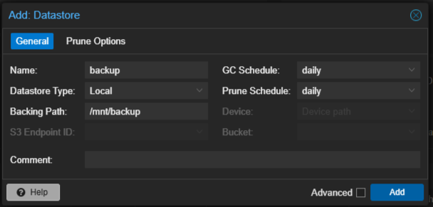 Datastore adalah direktori tempat PBS menyimpan seluruh file backup. Anda dapat membuat lebih dari satu datastore untuk memisahkan jenis backup (misalnya, backup harian dan arsip bulanan.)