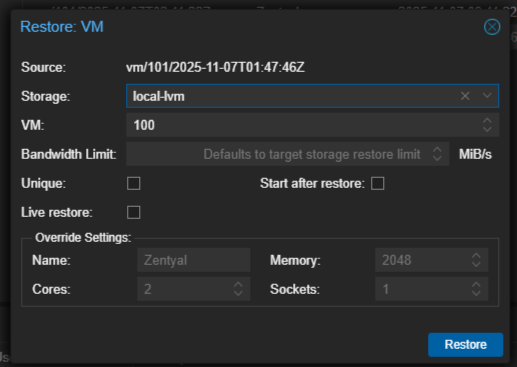 · VM ID: Secara default, ID akan sama seperti saat backup dibuat. Anda dapat menggantinya untuk menghindari konflik dengan VM yang sudah ada.