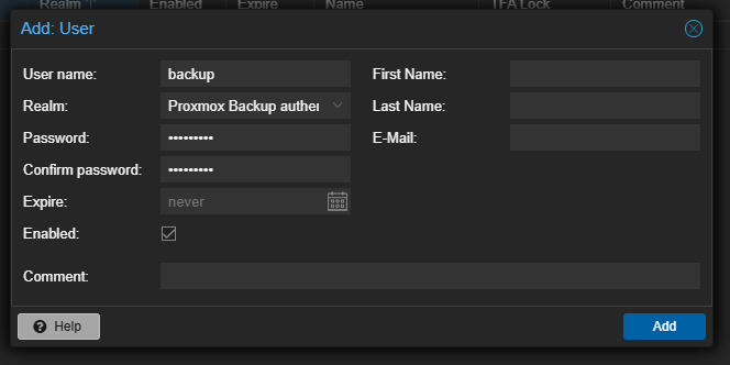 3. Pilih pengguna pada menu dropdown (misalnya backup@pbs).