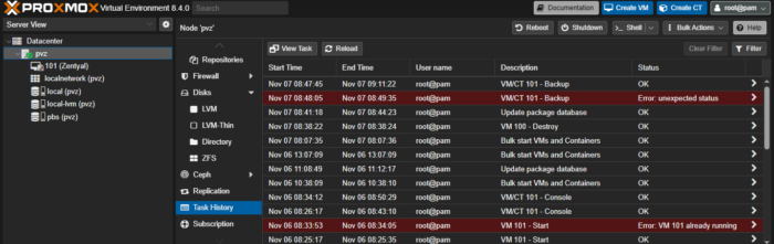 · Hasil backup otomatis dapat dilihat di Datacenter → Task History.