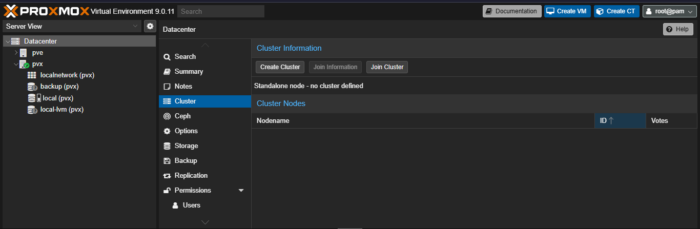 Untuk menggunakan fitur migration di Proxmox, Anda harus memiliki setidaknya 2 node dalam 1 cluster. Anda dapat membuat cluster melalui Web GUI dengan: