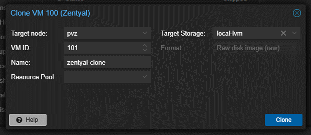 · Target storage: Storage dalam node yang digunakan untuk menyimpan hasil clone (misalnya local-lvm).