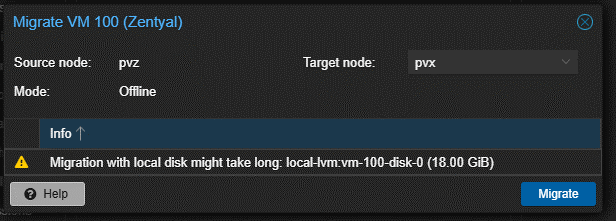 Jika shared storage tidak tersedia, Proxmox akan melakukan migration dengan memindahkan file disk secara penuh, yang tentunya lebih lama.
