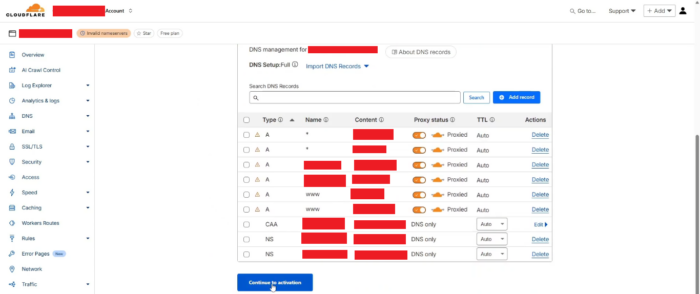 Tinjau dan pastikan DNS record yang ditampilkan sesuai, lalu klik pada “Continue to activation”.