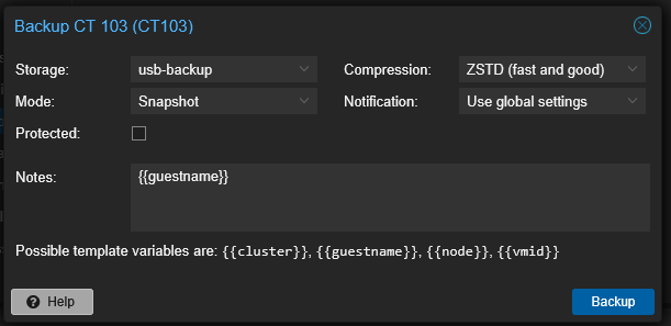 Setelah terkonfigurasi, USB drive dapat digunakan sebagai media penyimpanan backup VM/CT, dengan cara: